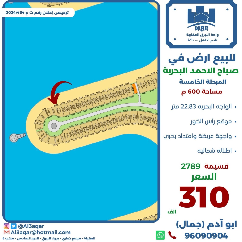 للبيع ارض في صباح الاحمد البحرية المرحلة الخامسة مساحة 600 متر الواجهه البحرية 22.83 متر موقع راس الخور واجهه عريضة وامتداد بحري اطلالة شمالية قسيمة 2789 السعر 310 الف