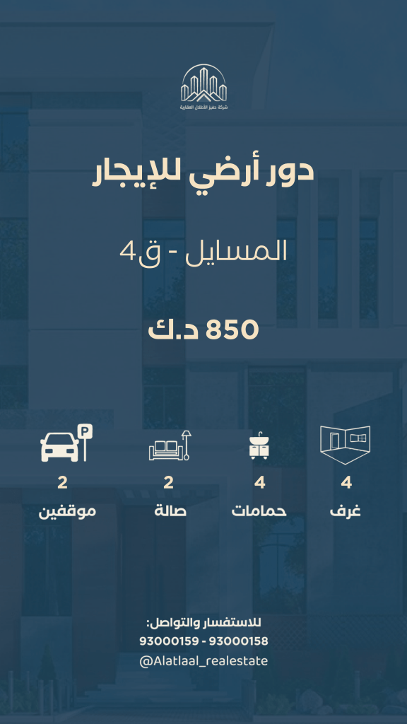 للايجار دور أرضي في المسايل قطعة 4 ، تشطيبات جديدة ومساحات واسعة ، موقع ممتاز مدخل ومخرج جداً سهل من الخط السريع وقريب من المسجد والخدمات